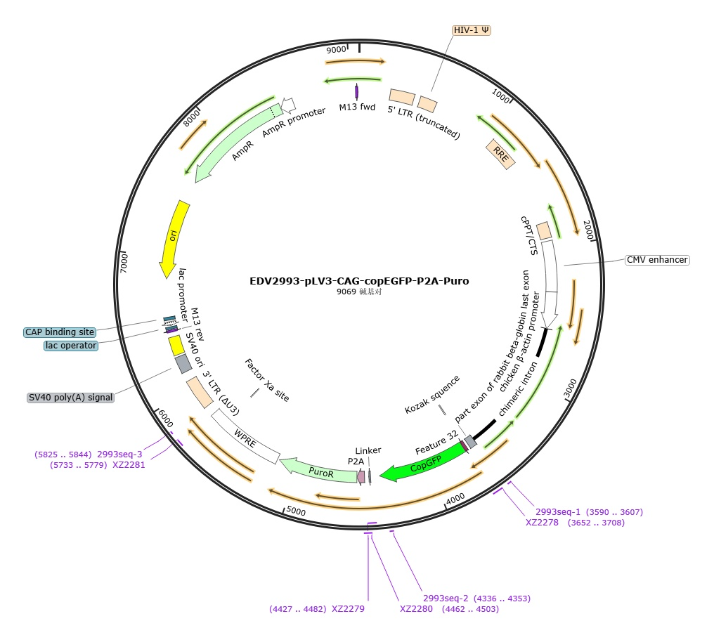 图1:pLV3-CAG-MCS-P2A-Puro骨架载体图谱