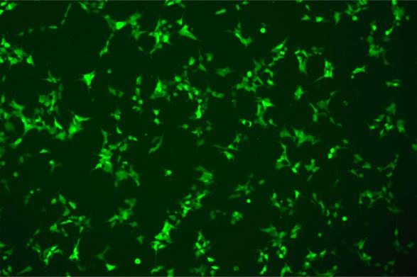 将CopEGFP基因序列克隆至慢病毒表达载体pLV3-CAG-MCS-P2A-Puro中,包装生产高滴度慢病毒颗粒,并感染人黑色素瘤细胞系A375。顺利获得荧光显微镜直接观察感染后细胞中EGFP报告基因的表达情况,评估过表达效率。